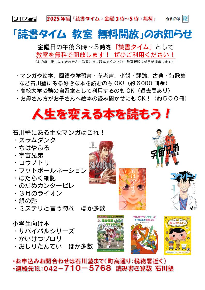 PDFで表示2025年度 夏/人生を変える本を読もう!/「読書タイム 教室 無料開放」のお知らせ /読書タイム(6000冊):金曜3時~5時:無料/042-710-5768