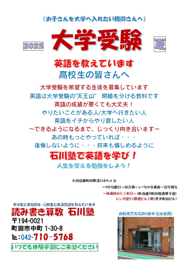 PDFで表示「2025夏 大学受験生募集」お子さんを大学へ入れたい親御さんへ/高校生に英語国語を教えています/英語の成績が悪くても大丈夫/できるようになるまでじっくり向き合います/石川塾で!人生を変える勉強をしよう!
