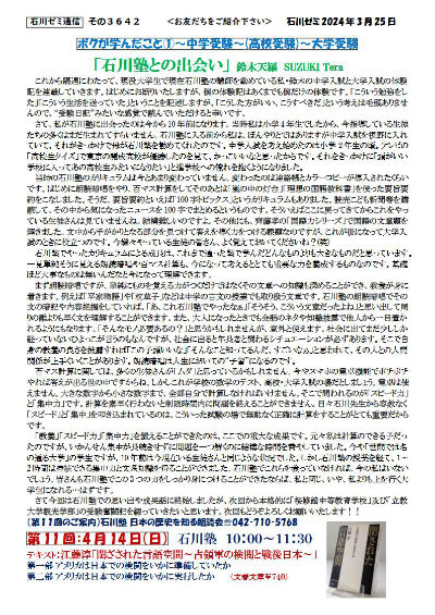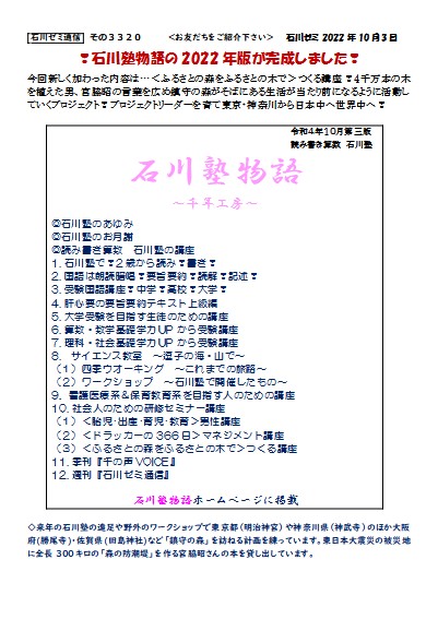 PDFで表示石川ゼミ通信/石川塾物語(全20ページ/2022年10月第3版発行)毎週紹介/HP御覧の上/小冊子希望者には無料で郵送します/tel:042-710-5768(石川塾長まで)